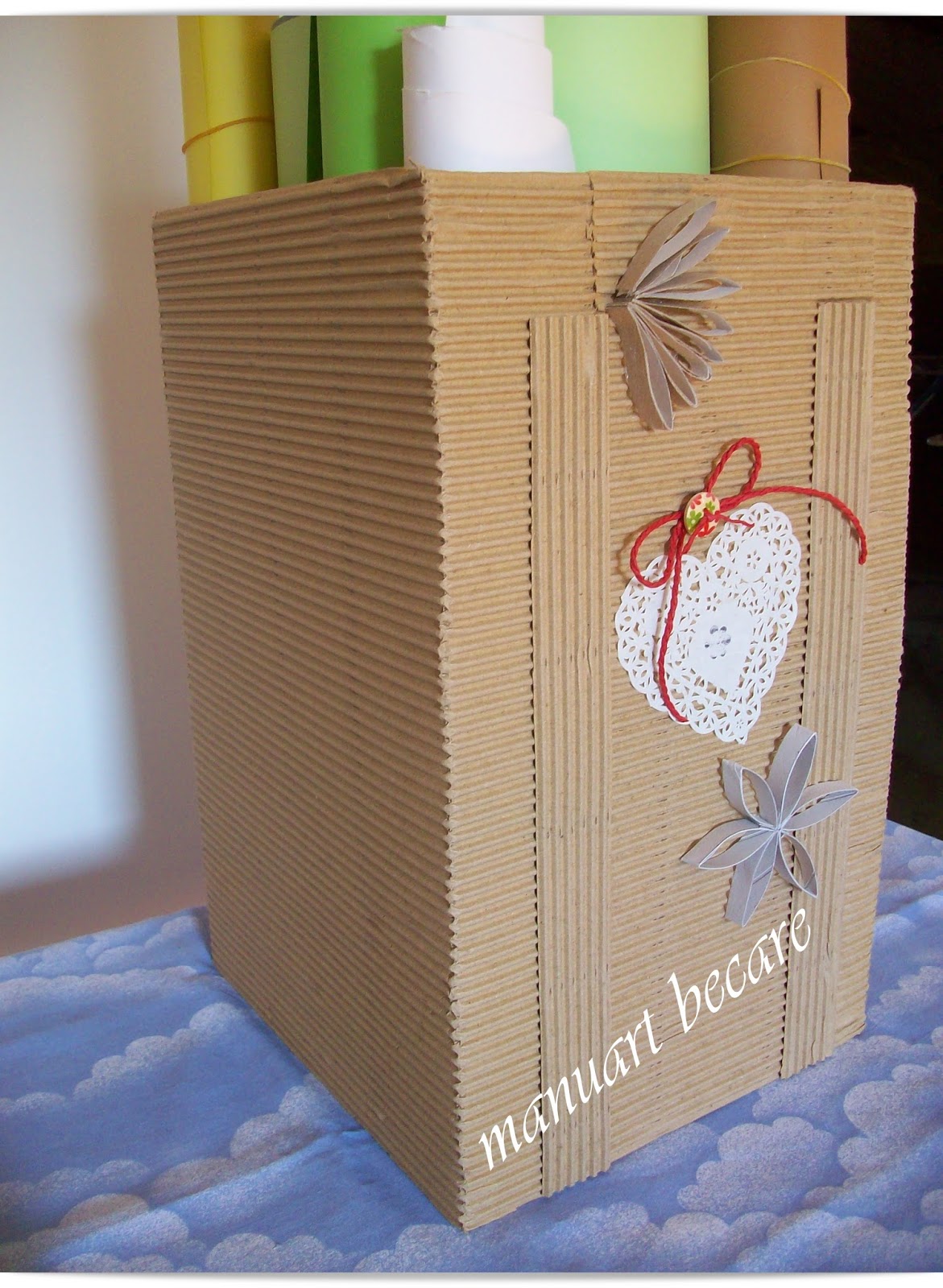Como adorno Unas rosetas hechas con un rollo de papel higiénico,una blonda en forma de corazón, Un trozo de cordón de papel y un botón de madera decorado.